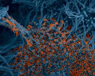 “Image colorisée de cellules bronchiques humaines (bleues) infectées par le virus SARS-CoV-2 (orange).